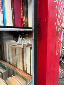 - Zum ersten Mal in den 14 Jahren seines Bestehens wurde unser Bücherschrank am Werderplatz beschädigt – abgesehen von den immer wieder angebrachten Schmierereien. Es gab einen „Brandanschlag“, dessen Folgen zum Glück beseitigt werden konnten. In diesem Zusammenhang wurden auch die Lücken im Boden verschlossen und ein neuer Griff angebracht.