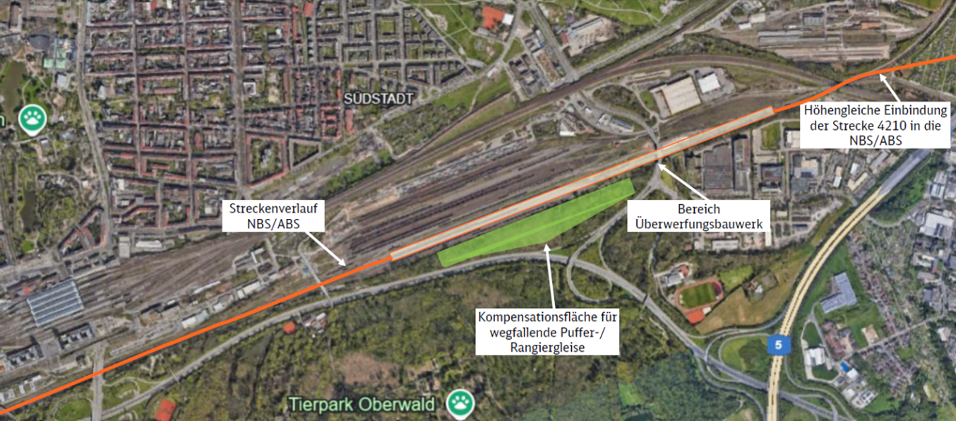 zusätzlichen Gütergleise ab Forst nach Süden mit der Bundesautobahn (BAB) A5 (westlich der A5 verlaufend) und endet im Karlsruher Güterbahnhof (Gbf), und dies formal, weil das Projekt NBS/ABS Mannheim – Karlsruhe im Gbf planungsbegrenzt ist. Die Vertreter der Stadtverwaltung und die der Bürgervereine haben immer wieder nachgefragt und angemahnt, den Anschluss der neuen Gleise an die bestehenden südlichen Trassen nach Ettlingen (4000) und Durmersheim (4020) und deren Kapazitätsbelastung in erforderlicher Tiefe zu planen. Auch Anfragen beim Bahnprojekt Basel – Karlsruhe führten nicht weiter, da dieses Projekt keine Schnittstelle zum Projekt NBS/ABS Mannheim – Karlsruhe aufweist und als Zielpunkt den Hauptbahnhof (Hbf) hat. Es fehlt also nach wie vor eine integrale Betrachtung/Planung des gesamten Karlsruher Stadtgebiets auch im Süden. Es ist jetzt der Zeitpunkt gekommen, an dem wir diese Planungslücke nicht länger hinnehmen und nicht akzeptieren können.